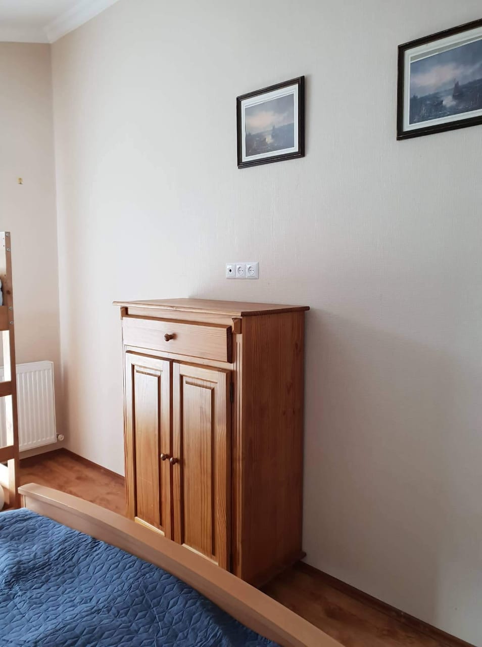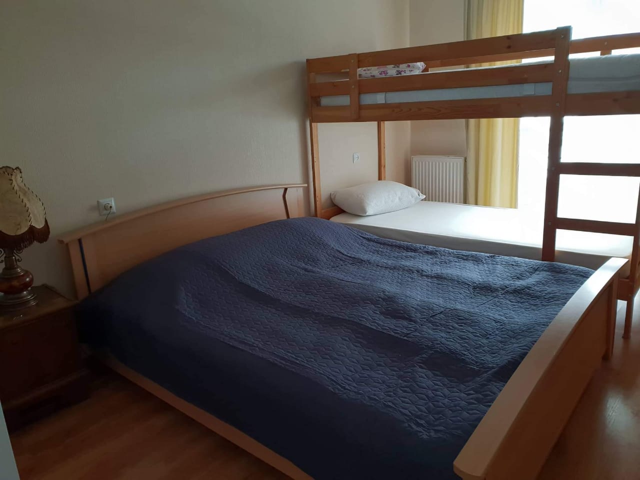 1 საძინებელში დგას 1 დიდი საწოლი და ორსართულიანი საწოლი